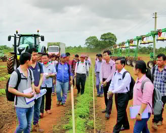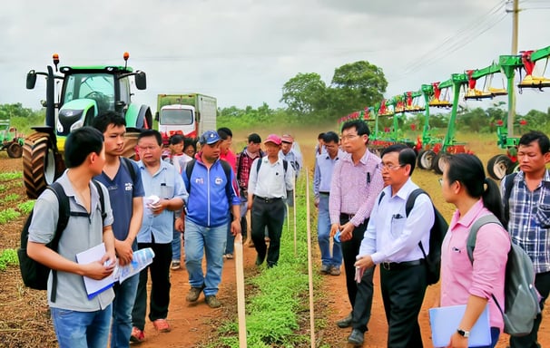They depict participants observing agricultural techniques, modern machinery, and precision farming tools in action during the farm visits